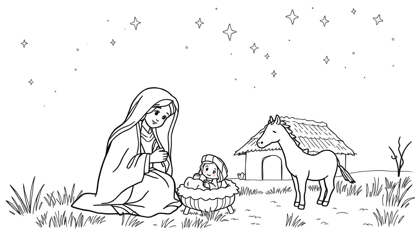 Una pagina da colorare in bianco e nero che raffigura la Sacra Famiglia e gli animali durante la Natività. La Vergine Maria è inginocchiata, Gesù Bambino giace nella mangiatoia, e un cavallo riposa vicino a una capanna sotto un cielo stellato.