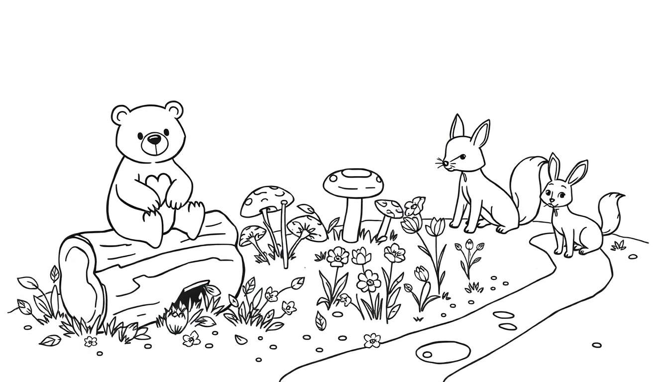 Una deliziosa pagina da colorare in bianco e nero che raffigura un tenero orsetto seduto su un tronco d’albero con un cuore, circondato da una ricca flora boschiva con funghi colorati e fiori. Accanto, una volpe curiosa osserva un coniglio più piccolo, mentre un sentiero serpeggia verso il basso. Perfetta per stimolare la creatività dei bambini e degli amanti della natura.