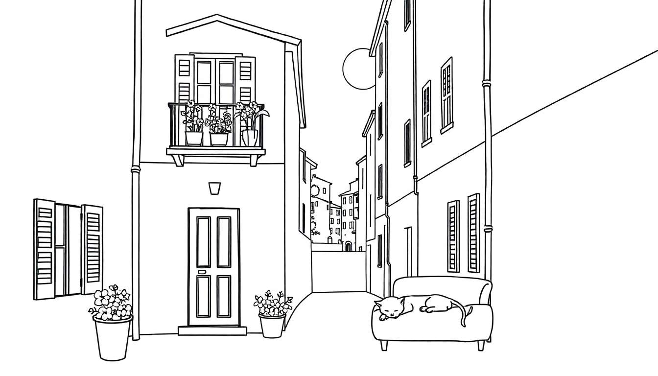 Questa pagina da colorare ci trasporta in un’affascinante scena notturna, dove il tempo sembra essersi fermato. Il disegno, con il suo stile lineare e senza colore, invita a dare vita a un vicolo suggestivo, probabilmente situato in un borgo antico o in un quartiere storico. La composizione è ricca di dettagli che evocano un senso di tranquillità e intimità: edifici con tetti spioventi, finestre con persiane che suggeriscono vite vissute, e balconi ornati da vasi di fiori rigogliosi. La presenza del divano con il gatto rannicchiato, immerso in un sonno profondo, aggiunge un tocco di calore domestico a questa immagine altrimenti silenziosa. La luna nel cielo conferma l’ambientazione serale, creando un’atmosfera sognante e quasi magica.
